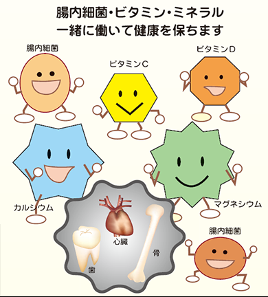 カルシウムとマグネシウムは一緒に働いて健康な歯や骨をつくり、心臓や血管の健康を維持しています。ビタミンCはカルシウムの働きを高めます。また、ビタミンDはカルシウムを運び、沈着させるためになくてはならないものです。そして腸内細菌は、いろいろなビタミンをつくり、カルシウムなどのミネラルの吸収や余分なミネラルの排出に役立っています。